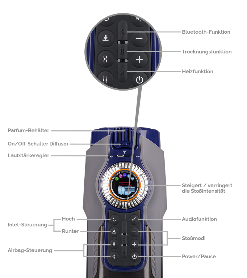 8. Die beiden Tasten mit Wellensymbol steuern die Airbag-Funktion. Drücken Sie die untere Airbag-Taste, um Modus 1 zu aktivieren. Drücken Sie die Taste erneut, um zum nächsten Modus zu wechseln. Drücken Sie die obere Airbag-Taste, um zum vorherigen Modus zurückzukehren.