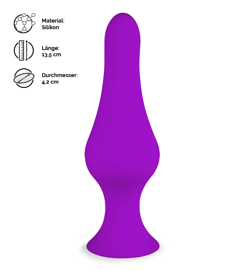 Dieser Analplug hat eine Gesamtlänge von 13,5 cm. Der einführbare Teil ist 11,5 cm lang. Der Durchmesser erreicht an der dicksten Stelle des Schafts 4,2 cm. Damit eignet sich dieser Analstöpsel aus Silikon sowohl für Einsteiger als auch für Fortgeschrittene.