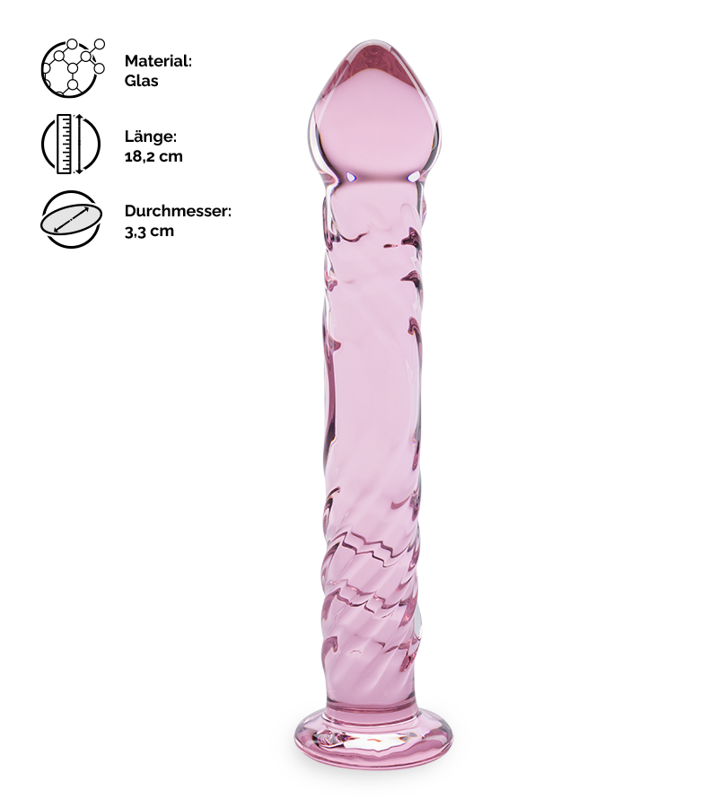 Der Glasdildo hat einen kerzengeraden Schaft, der mit einer feinen Reliefschicht überzogen ist, der für sanfte bis intensive Massageeffekte sorgt. Die Spitze des Dildos ist etwas dicker als der Rest und stimuliert bei jeder Bewegung des Dildos in Vagina oder Anus. Der Dildo ist aus durchscheinendem Glas gefertigt und in einem hellen Rosa getönt. Der Dildo eignet sich für die vaginale und anale Stimulation und kann vor dem Einführen in kaltes oder warmes Wasser getaucht werden, um auch mit prickelnden Temperaturreizen zu verwöhnen.