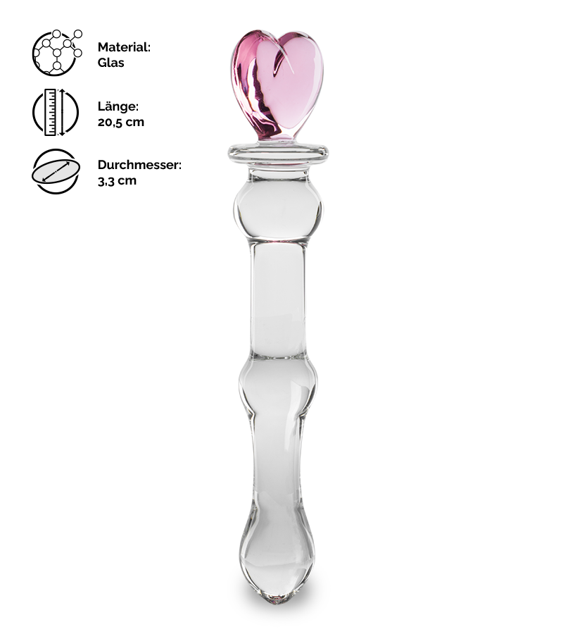 Der Dildo ist komplett aus Glas gefertigt und hat somit hypoallergene Eigenschaften. Er ist sehr pflegeleicht und leicht zu reinigen. Das Ende des Dildos ist mit einem hübschen rosafarbenen Herz verziert, in das Sie sich garantiert sofort verlieben. Genießen Sie die vaginale oder anale Stimulation durch den Glasdildo. Drei Kugeln sorgen für Abwechslung und massieren durch den punktuell etwas größeren Durchmesser intensiv. Mit ein wenig kaltem oder warmem Wasser kann der Glasdildo für Temperatureffekte auf die richtige Temperatur gebracht werden.