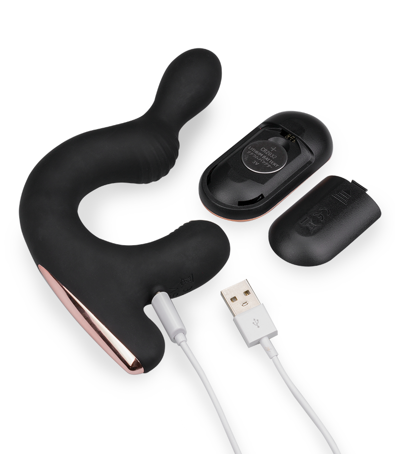 Im Lieferumfang ist ein USB-Ladekabel enthalten, mit dem Sie den Akku des Hoden-Massagers aufladen können. Die Funkfernbedienung ist batteriebetrieben. Eine passende 3V-Knopfzellenbatterie (plus eine Ersatzbatterie) ist ebenfalls enthalten.