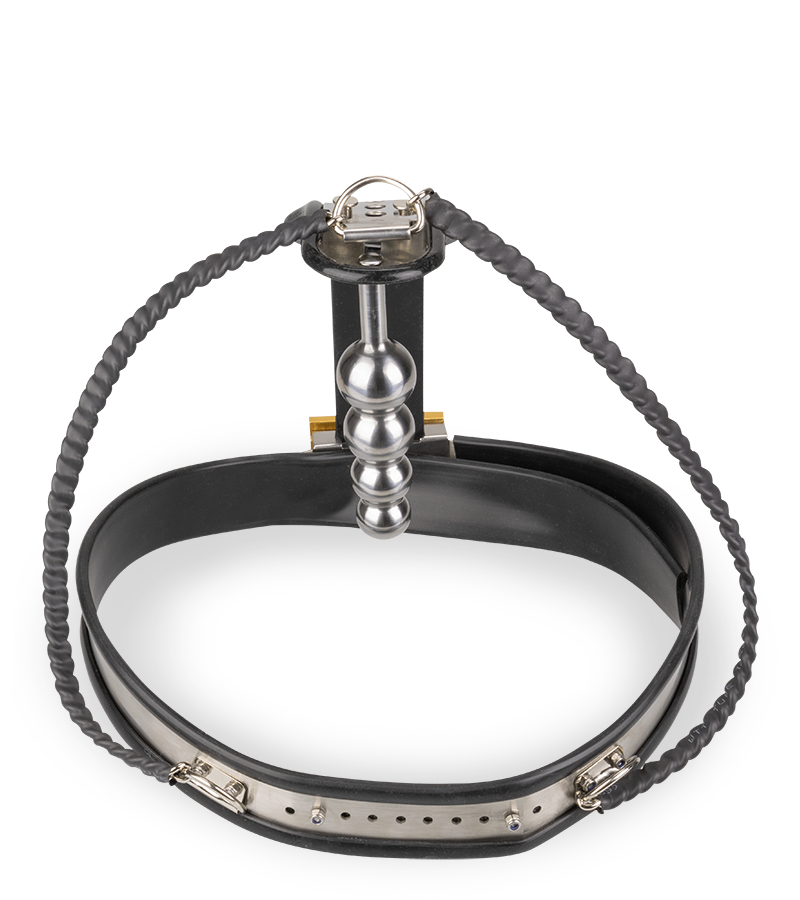 Der Keuschheistgürtel Immobile verfügt vorne über eine Metallplatte, die auf dem weiblichen Intimbereich aufliegt und eine Penetration oder Stimulation von Klitoris, Schamlippen und Vagina verhindert. Dafür befindet sich hinten aber ein Analplug mit einem Schaft aus vier übereinanderliegenden Kugeln, deren Massagewirkung Sie bei jeder Bewegung spüren können.