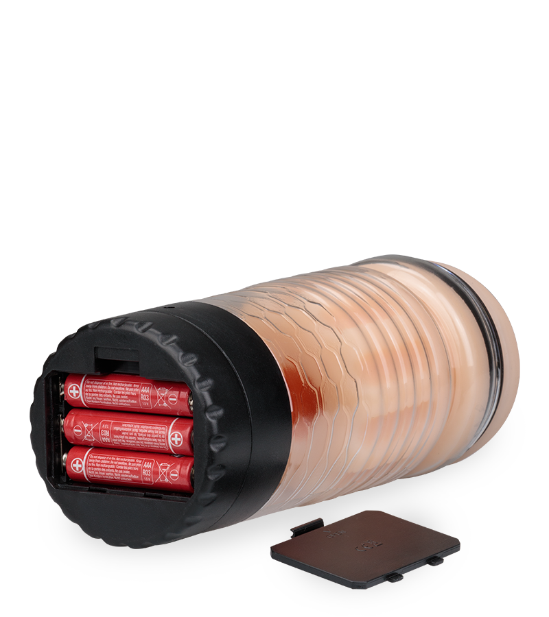 1. Öffnen Sie die Abdeckung unten am Masturbator und legen Sie die drei erforderlichen LR03-Batterien ein. Achten Sie dabei auf die Angaben zum Plus-/Minuspol.