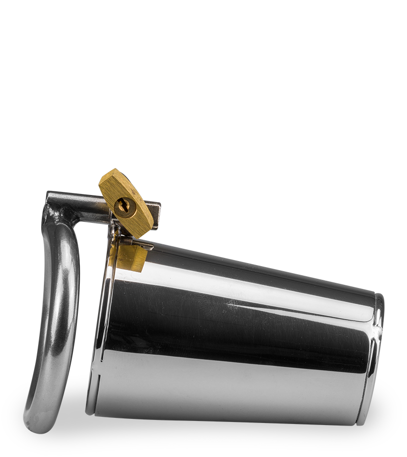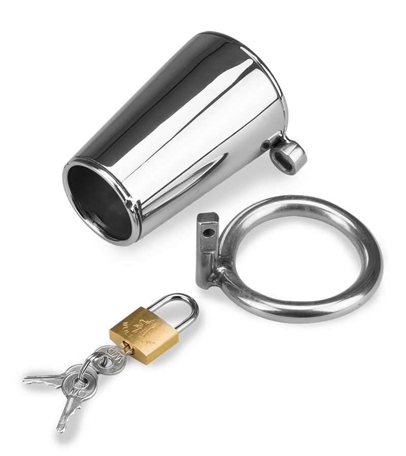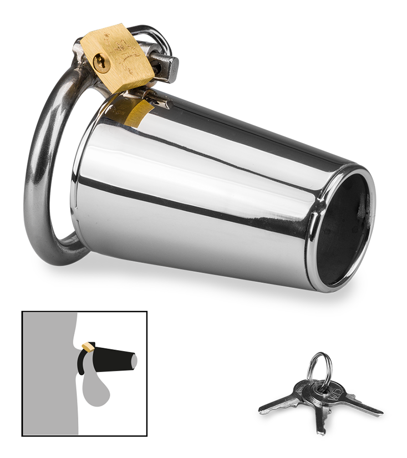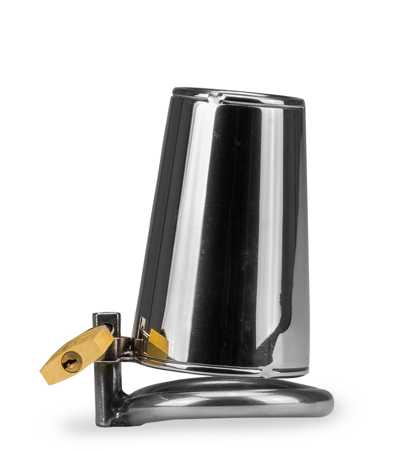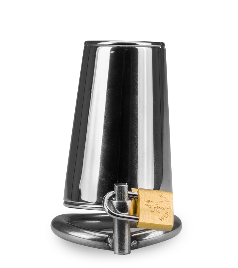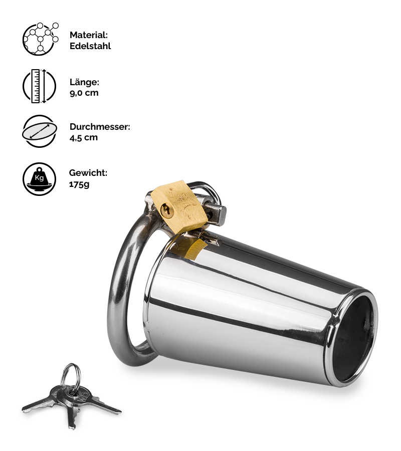 Der Keuschheitsgürtel hat eine konische Form, die sich nach vorne verjüngt. Ihr Penis wird komplett eingeschlossen, wodurch eine Erektion unmöglich wird. Sobald Sie leicht erregt sind, spüren Sie die Enge des Peniskäfigs. Damit Sie sich nicht selbst aus dem Gefängnis der Lust entlassen, wird der Peniskäfig Domina mit einem kleinen Schloss und drei Schlüsseln geliefert.