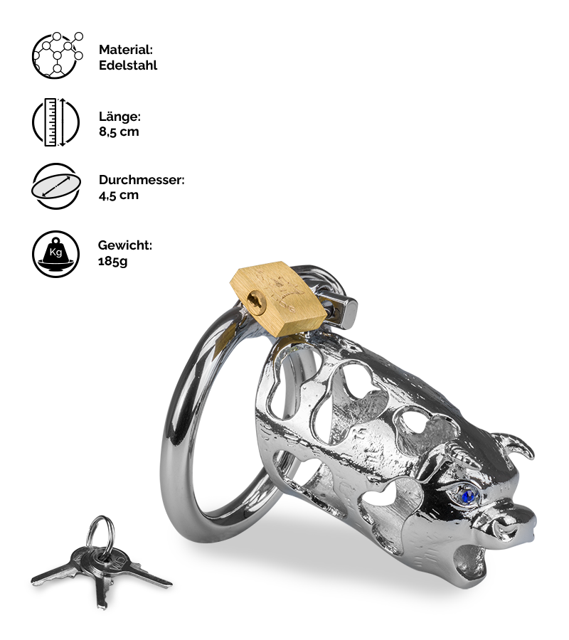 Der Keuschheitskäfig im Büffel-Design ist 8,5 cm lang. Der Ring, der hinter den Hoden positioniert wird hat einen Durchmesser von 4,5 cm. Er wird mit einem Vorhängeschloss und 3 Schlüsseln geliefert.