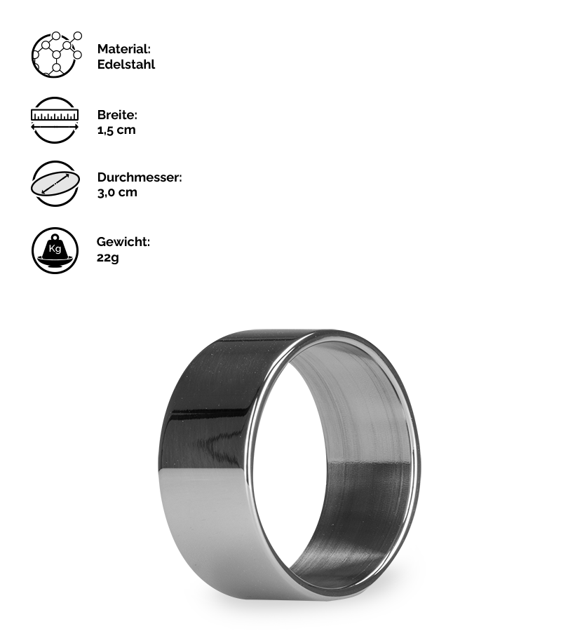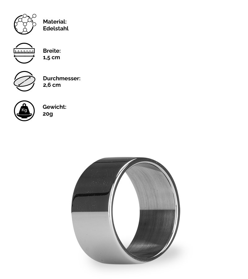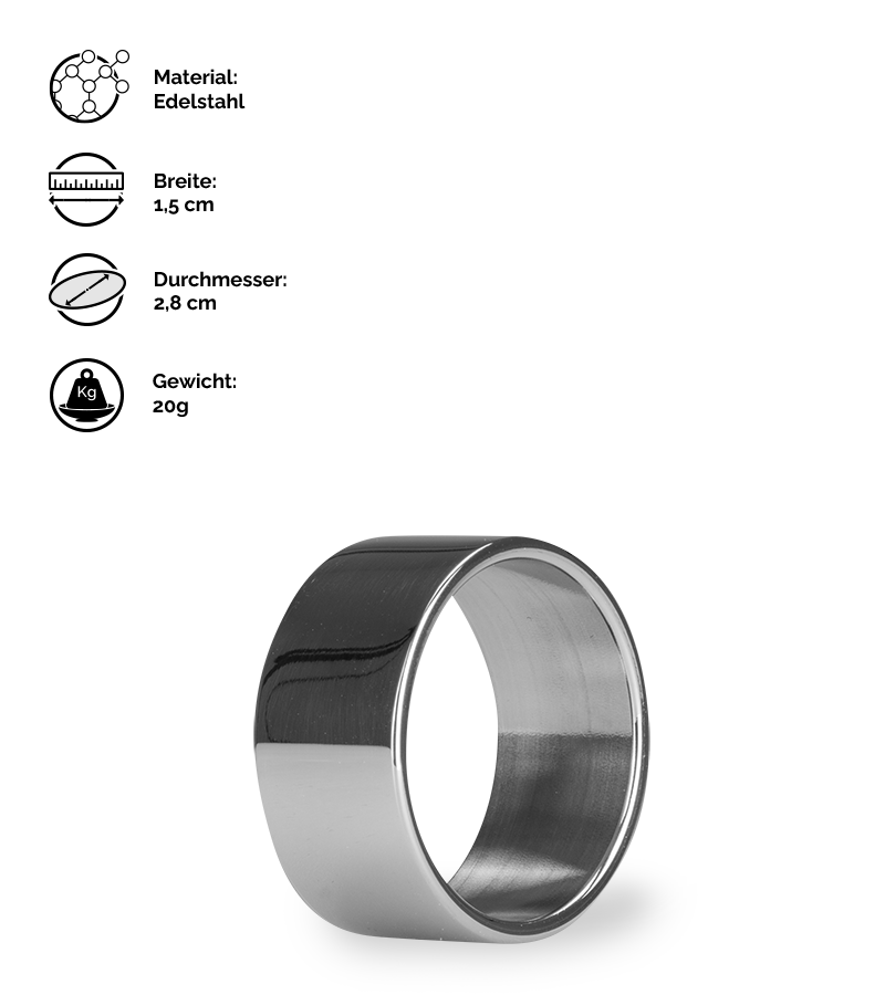 Je nach Größe hat der Cockring folgende Durchmesser: 2,6 cm, 2,8 cm und 3 cm. Der Ring ist in allen Größen 1,5 cm breit.