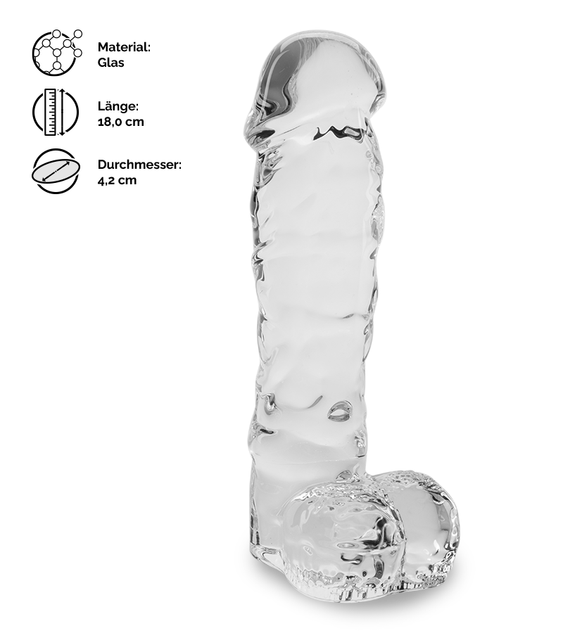 Der realistische Glasdildo Leo ist 18 cm lang. Er hat eine Schaftlänge von 14,5 cm und einen Durchmesser von 4,2 cm auf Höhe der Eichel. In Richtung Basis nimmt der Durchmesser dann wieder leicht ab.