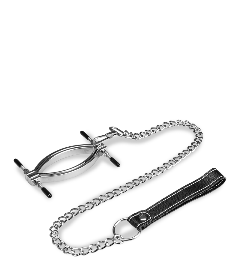 Der Schamlippenspreizer klemmt die Schamlippen ein und öffnet den Zugang zu Klitoris und Vagina. An der Klemme sind vier Stellschrauben befestigt, mit denen Sie selber entscheiden können, wie stark der Druck und damit der Schmerzreiz sein soll. Wenn Sie die mitgelieferte Leine an der Schamlippenklemme befestigen, können Sie Ihre Spielchen rund um Unterwerfung und Dominanz auf die Spitze treiben!