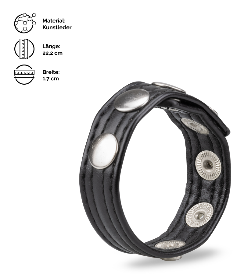 Der Penisring aus Kunstleder sieht mit seinen vier Druckknöpfen aus wie ein kleiner Gürtel. Dank der Druckknöpfe können Sie den Durchmesser des Penisrings individuell festlegen. Befestigen Sie den Penisring einfach hinter den Hoden und lassen Sie sich von der Wirkung überraschen, die der kleine Ring auf Ihre Erektion hat. Durch das feste Material, das nicht nachgibt, wird die Erektion härter und Sie haben eine bessere Ausdauer.