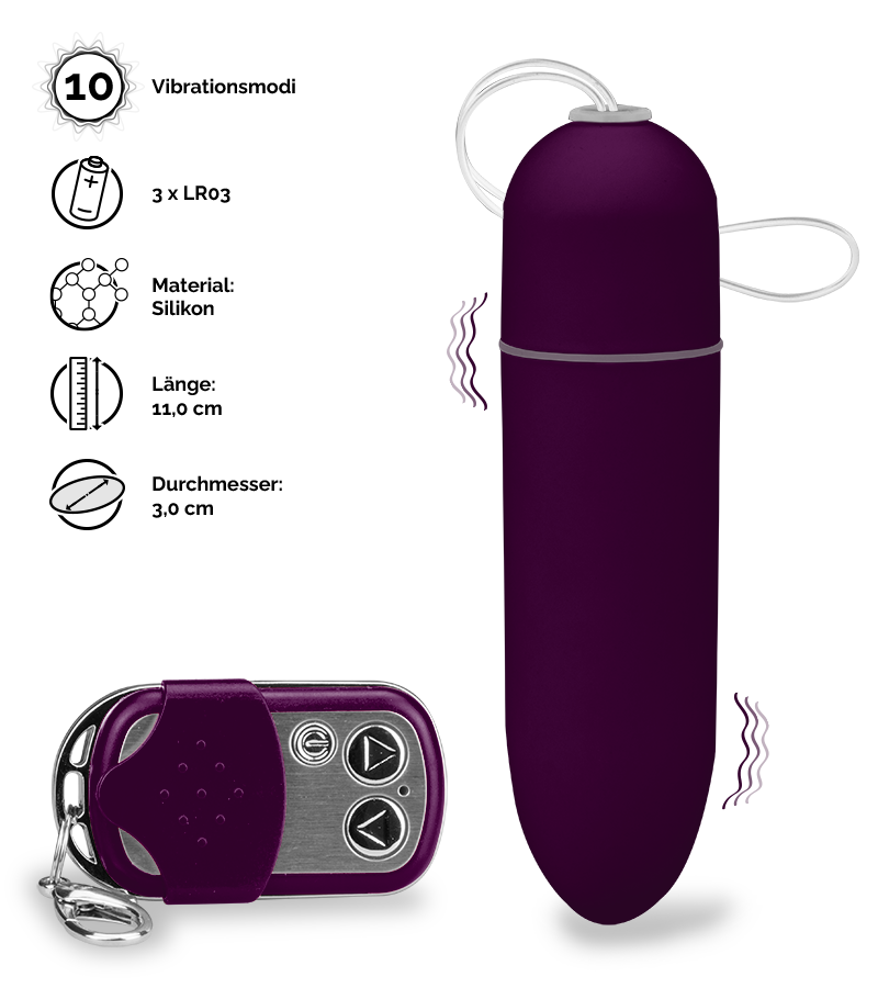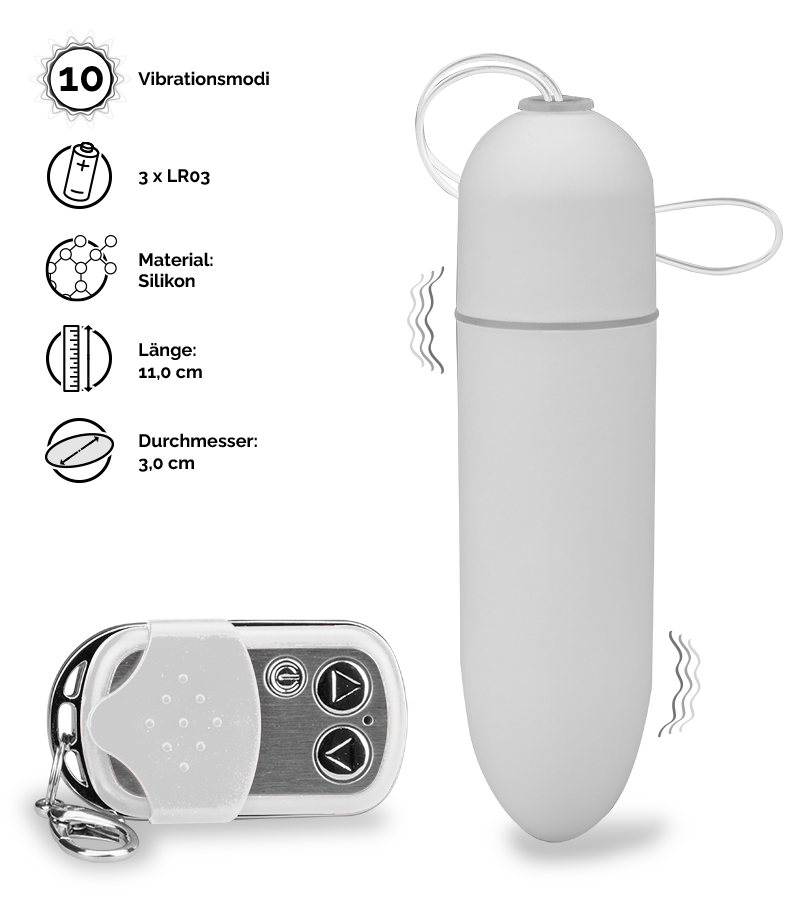 Dieses Vibroei ist ein Modell in XXL. Es schenkt Ihnen kraftvolle und tiefe Intimmassagen. Die 10 verfügbaren Vibrationsmodi können über eine kabellose Fernbedienung aktiviert und ausgewählt werden. Für lustvolle Experimente auch außer Haus überlassen Sie die Funkfernbedienung einfach Ihrem Partner oder Ihrer Partnerin.